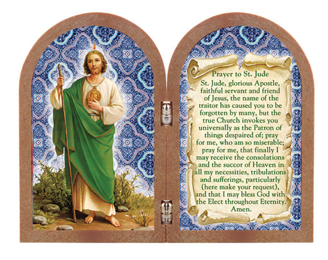 Gold embossed natural wood St Jude standing diptych with prayer. Diptych size: 5" x 3 1/2" Made in Hungary. Polybag.