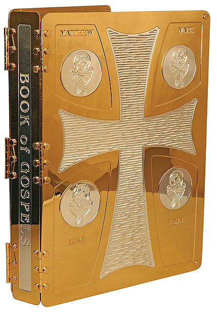 Book of Gospels Cover. Solid brass with Four Evangelists engraved on cover. To fit Catholic Book version (14-1/4 inch high x 10-1/4 inch wide x 2 inch deep.). Silver and 24 karat gold plated.