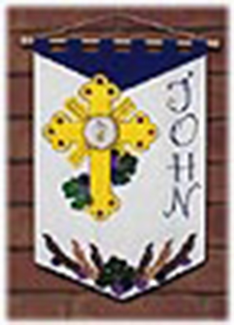 Contains everything required to make a First Communion banner, including pre-cut felt shapes, acrylic gems, glitter glue, chenille stem, gold cord, birch dowel and caps, glue pen, and detailed instructions with numerous creative design ideas. Finished size 12" x 18". If you would like to use felt letters for names, please see item 917 which is sold separately.