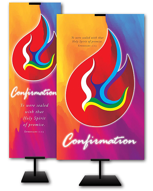 Made of fabric with full color Confirmation theme design. 36" wide by 60" high. The banner has pole pocket suitable for a rod..