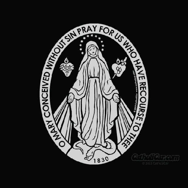High-quality peel-and-apply vinyl decals. They’re printed in metallic-silver ink on transparent vinyl and given a protective clear-coat overlaminate. "O MARY CONCEIVED WITHOUT SIN. PRAY FOR US WHO HAVE RECOURSE TO THEE" test all around 4-1/4" x 5-3/4"
