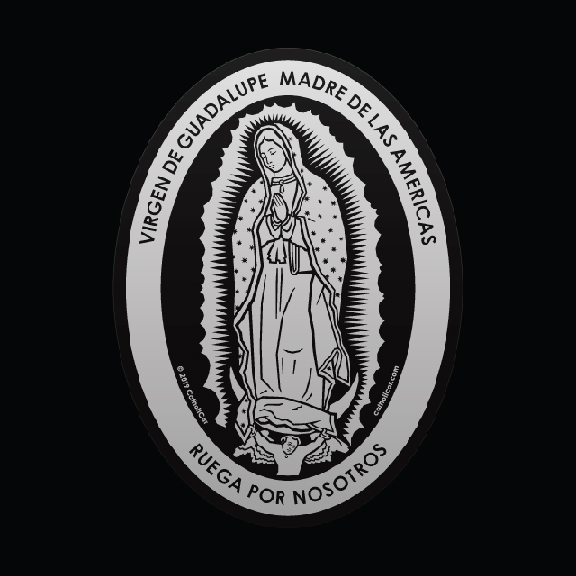 High-quality peel-and-apply vinyl decals. They’re printed in metallic-silver ink on transparent vinyl and given a protective clear-coat overlaminate. "VIRGEN DE GUADALUPE MADRE DE LAS AMERICAS" text on top and ""RUEGA POR NOSOTROS" text on bottom. 3-1/2" x 4-3/4"