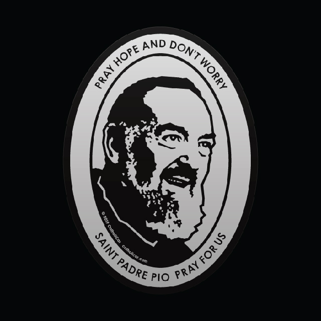 High-quality peel-and-apply vinyl decals. They’re printed in metallic-silver ink on transparent vinyl and given a protective clear-coat overlaminate."PRAY HOPE AND DON'T WORRY" top text and "SAINT PADRE PIO PRAY FOR US" bottom text 3-1/2" x 4-3/4"