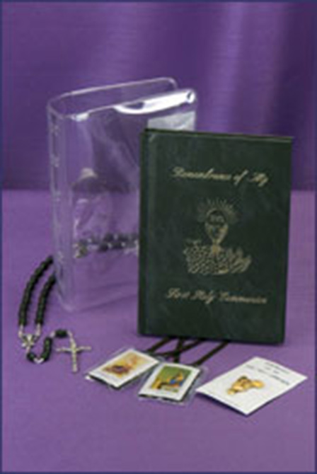 Set features a hard cover Marian book, black rosary with vinyl case, Communion pin and scapular. Set comes complete with a clear vinyl case.