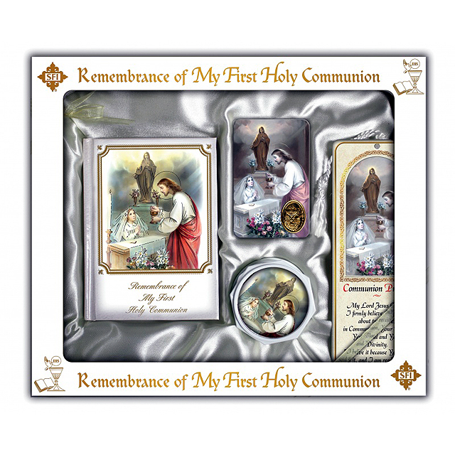 Gift Set includes First Communion Missal, Rosary with Rosary Case, Bookmark, Holy Card, Scapular and Lapel Pin. Attractively gift boxed.