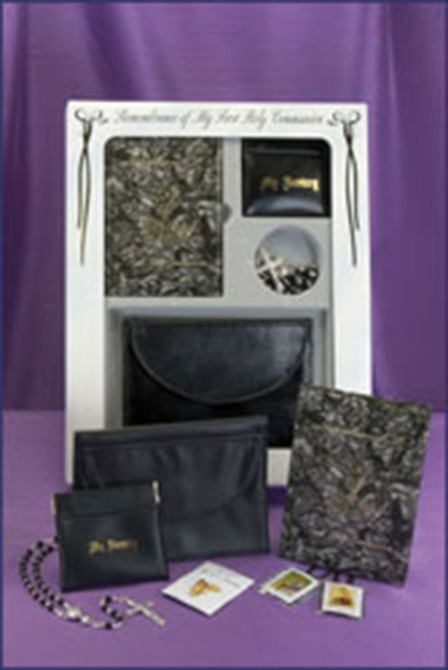 Deluxe set includes a padded pearlized look cover of a Marian children's mass book with gold edges, imitaition leather case for the mass book,squeeze top rosary case with black glass rosary, scapular and Communion pin. Gift boxed.