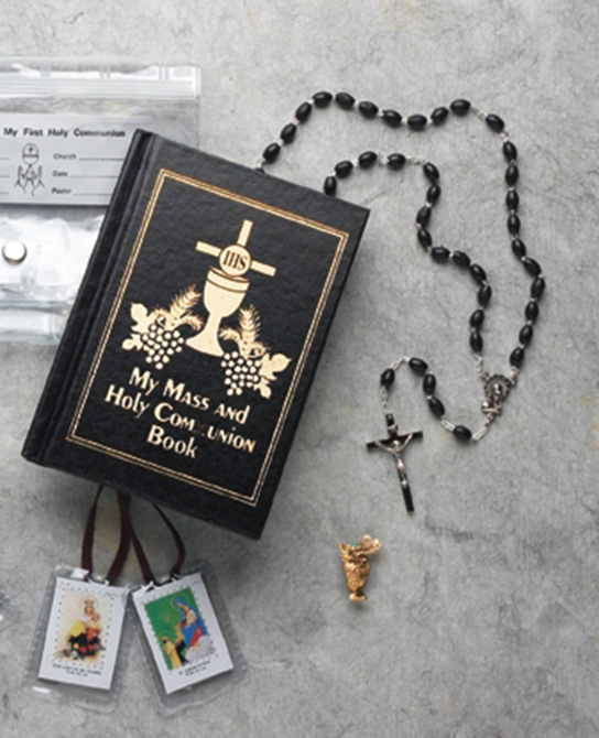 Boy's Communion set, includes a clear carrying case, hard cover book, rosary, scapular and Communion pin.