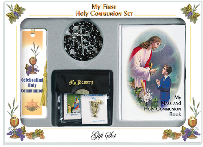 Gift set consisting of full color laminated book, black rosary, rosary case, bookmark, scapular and Communion pin.