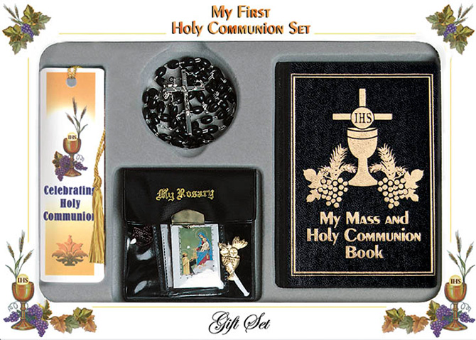 Boy's Communion set, complete with embossed textured cover book, rosary case, black rosary, bookmark, scapular and Communion pin. Gift boxed.