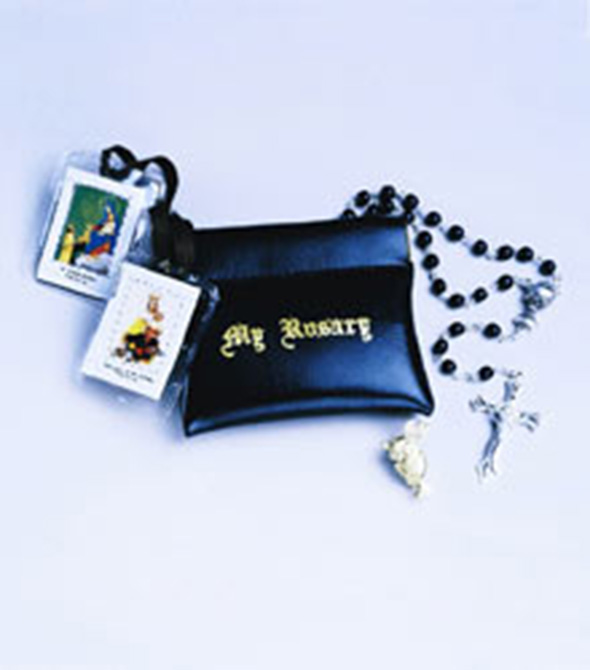 Soft black vinyl squeeze case with black glass rosary, laminated scapular and Communion pin.