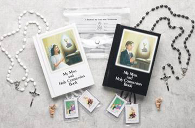 Boy's Communion set in clear plastic case complete with full color laminated book, black rosary, scapular and Communion pin.