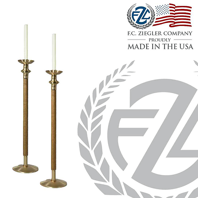 Processional candlestick made from a combination polished and satin finished brass and wood in medium oak stain. Weighted base for stability. Standard sockets are 1-1/2". 43" tall. Processional portion weighs 5.4 pounds.