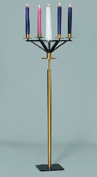 53" height, 24" diameter, dull black and satin bronze finish. Aluminum metal wreath. Specify candle socket size when ordering. (Candles not included.)