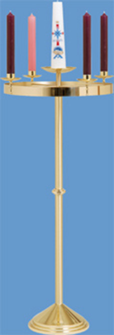 Advent Wreath. Rigid, non-removable, two-tone finish. 12 inch base, 21 inch ring. 48 inch high to top of ring, 1-1/2 inch sockets. Center spikes adaptable to any size candle. Candles not included.