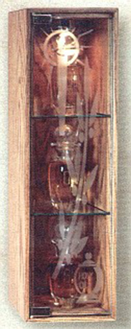 Made of oak, medium finish, etched design on glass door, locking door, wall mountable, 8" x 8" x 27". No interior lighting.