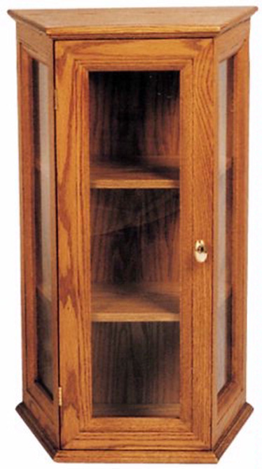 Solid oak with glass panels and adjustable wood or glass shelves. 17"W. x 10"D. x 28"H.