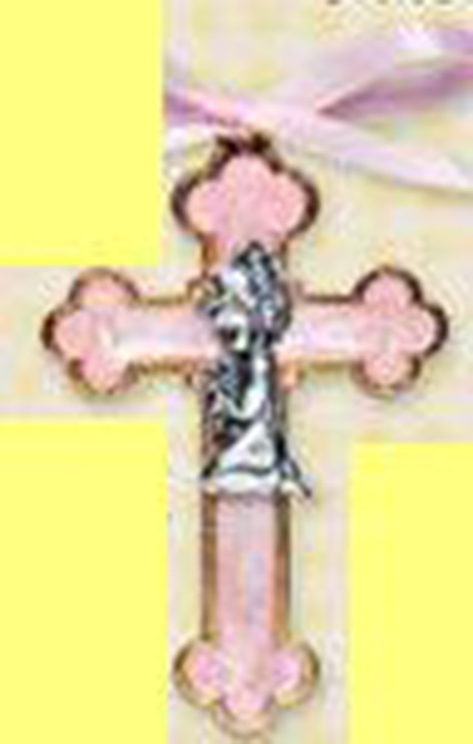 Pink pearl enameled cross of a praying girl outlined in gold tone. No longer comes with ribbon as shown. Boxed. 4-1/2