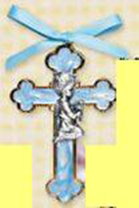 Blue pearl enameled cross of a praying boy outlined in gold tone. No longer comes with ribbon as shown. Boxed. 4-1/2