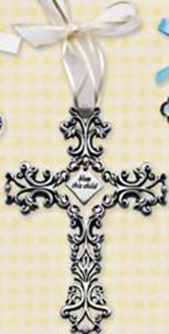 Filigree cross adorned with white pearls and ribbon. Verse reads " bless this child" Gift boxed. 5-1/2