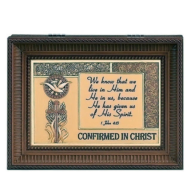 Resin Confirmation face that has a descending Holy Spirit, cross and wheat and text that reads " We know that we live in Him and He in us, because He has given us of His Spirit 1 John 4:13" "CONFIRMED IN CHRIST" Brown box with wind-up music that plays How great Thou art when opened.