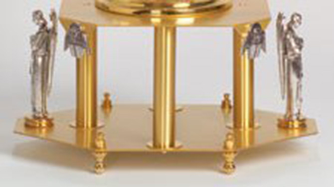 Thabor. 24 karat gold plated, two-tone bright and satin finish. Two angels and four medallions are oxidized silver plated. 7 inch high, 9-1/2 inch top plate, 14 inch base.