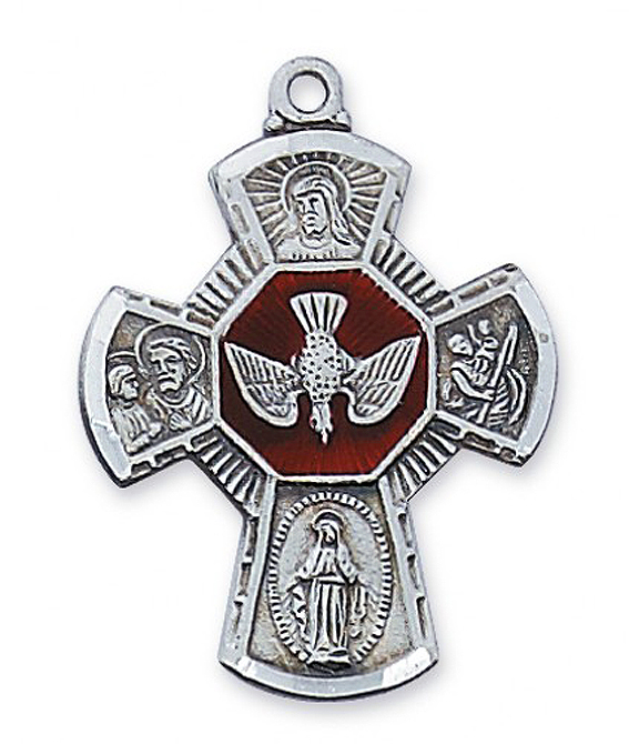 Sterling four way medal with red enamel on the center with the Holy Spirit on 24" rhodium plated chain. Gift boxed.