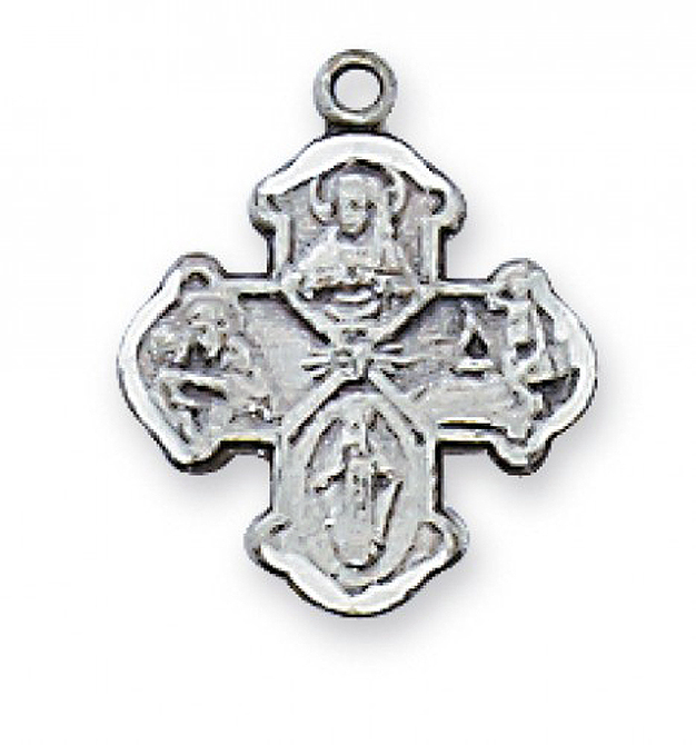 Sterling four way medal. With 16" rhodium plated chain. Gift boxed.