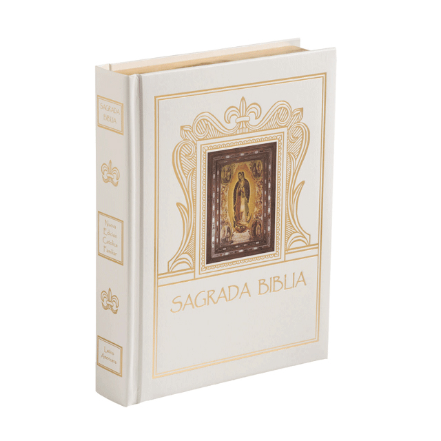 This classic Spanish Edition is set in the Catholic Latinoamericana translation. Ivory Padded Cover With Gold Embossing. Gold-Gilded Page Edges. Special section: Scripture Readings For Our Wedding Day (makes the family Bible a sacramental keepsake to be treasured for a lifetime)