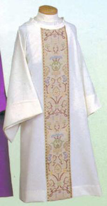 Dalmatic with Coronation Brocade panel. Made from 100% Polyester Linen Weave Monks Cloth. Colors available are Pure White, Off White, Purple, Blue, Red, Rose, Kelly Green and Hunter Green.