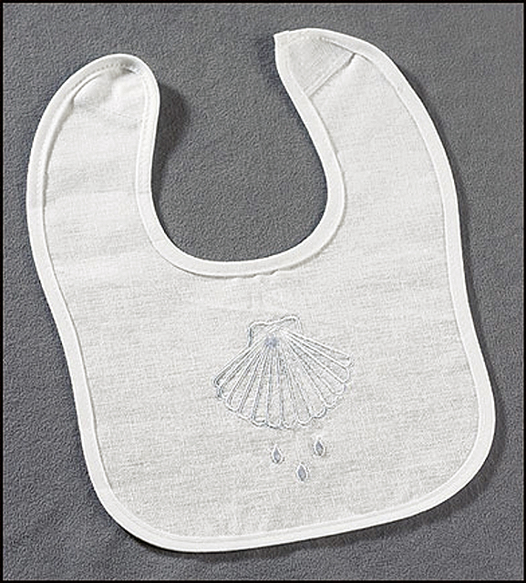 Baptismal Bib with embroidered Shell design, Velcro® closure. 55% Linen/45% Cotton Blend, 8 inches Wide x 10 inches high.