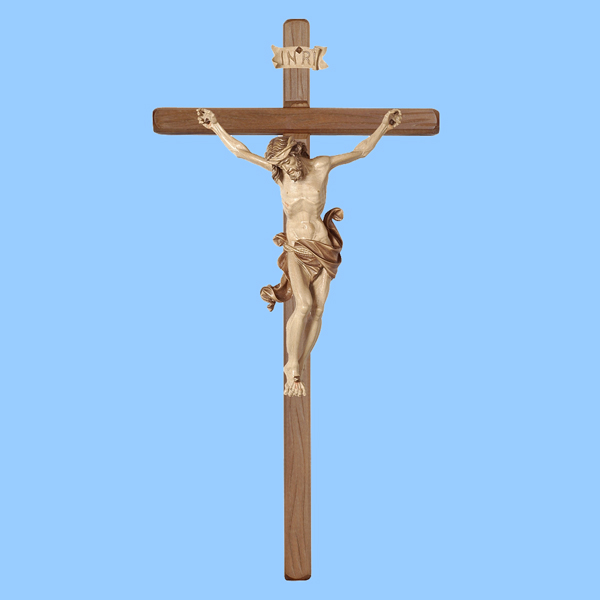 Genuine wood carved Maplewood Cross and Corpus not im color but stained in different shades of brown. Standard is on a straight cross but can be ordered on a bent cross. Other sizes available, please inquire or see page 378 of our catalog. Made in Italy.
