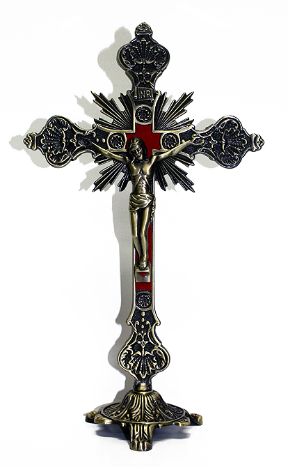 This standing Baroque style crucifix made with bronze metal has a silver finish with red enamel behind the corpus and stands 12 inch high.
