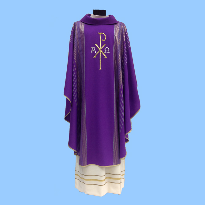 These fine Italian vestments with stand-up collar are made from Lines Style fabric (95% pure wool, 5% gold thread) with design on both front and back. Available in four liturgical colors (Red, White, Purple and Green). One size fits all.