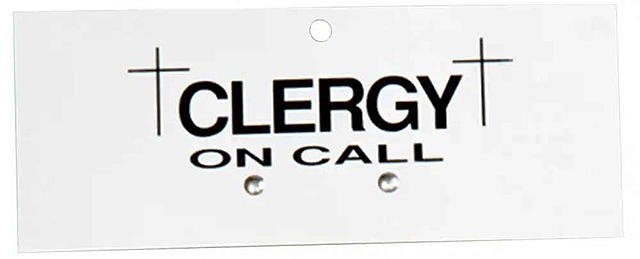 Clergy On Call Sign. Durable white vinyl, 3-1/2 inch x 7-1/2 inch, center hole for hanging. Attached visor clip on back.