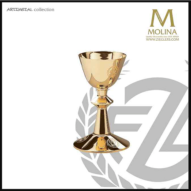 Cup is sterling silver cup with engraved symbols of the Three Virtues. Base features symbols Lamb, Px and Dove. 8-1/8" high, 4" cup diameter, 14 ounce capacity. Scale Paten included.