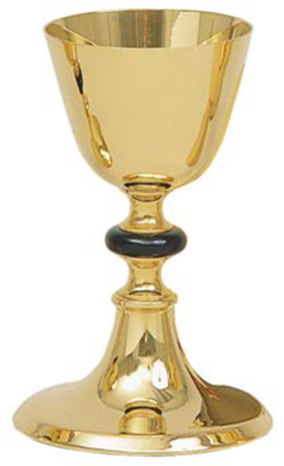 Chalice with 5-1/2 inch scale paten. 24 karat gold plated. 4-3/4 inch base. 7 inch high, 3-3/4 inch diameter cup, 10 ounce capacity Gold node also available.