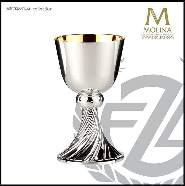 Made of brass with bright polished gold plated inside cup. Exterior finish is bright polished silver plated. Chalice measures 7-1/8" high, cup diameter is 4". Scale Paten included.