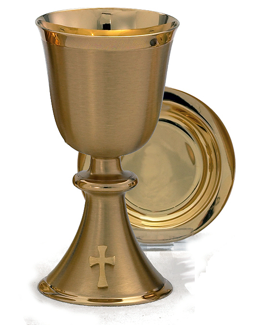 Made of brass with bright polished inside cup plated in 24kt gold. Exterior finish is gold plated. Chalice measures 5-1/2" high and holds 5 ounces. Paten is 3-1/4" in diameter. Matching Ciborium is available.