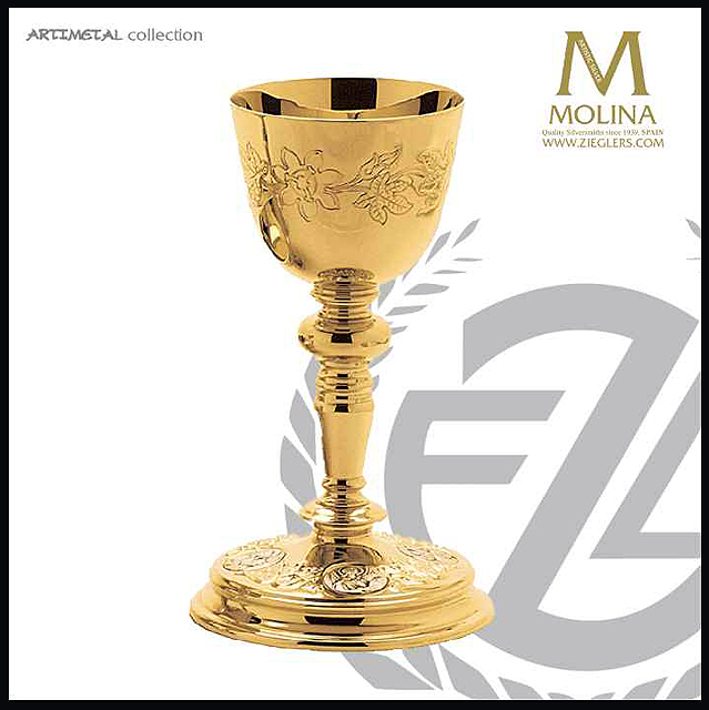 Sterling silver, gold plated classic design with hand engraved Flower of Passion around cup and Four Evangelist medallions on base. 9" high, 4-7/8" cup diameter, 14 ounce capacity.