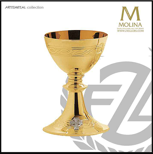 Sterling silver, gold lined, elegant incised Crown of Thorns motif with Celtic superimposed Cross on base. 8" high, 4-5/8" cup diameter, 16 ounce capacity.