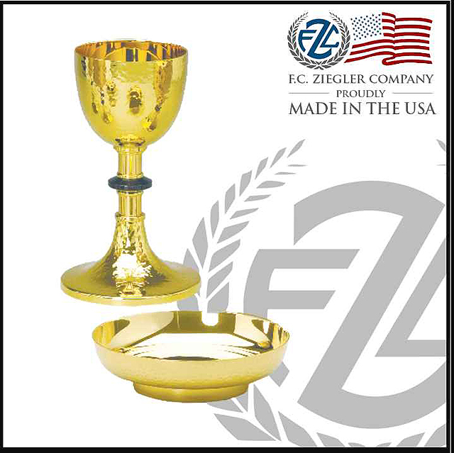 Made of brass with bright polished inside cup plated in 24kt gold. 8-5/8" high, 4" cup diameter, 6" paten diameter. Sterling silver cup available at additional cost. Outside finish is round hammered polished gold.