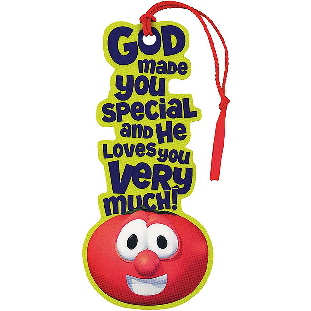 Young children, especially VeggieTales(R) fans, will enjoy this fun bookmark featuring Bob Tomato and the words "God made you special and He loves you very much!". Laminated durable card stock bookmark is about 6" long and is finished with a tassel.