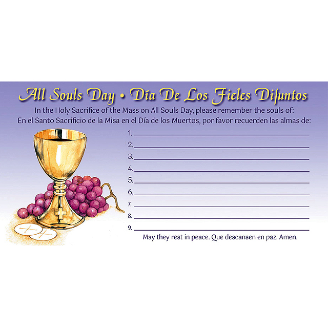 Full-color Bilingual offering envelope that has space to write in up to nine names on the front to remember on All Souls Day and the donor's name, address, envelope number and amount of donation on the back. Sold in packs of 100. Price break on 500 and 1,000.. 3-1/8" x 6-1/4"