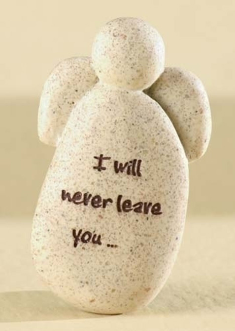 Angel Pocket Stone with the verse "I will never leave you". 2" high, made of resin.
