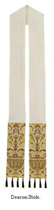 Deacon stole fully lined and interlined, wrinkle resistant polyester. Tapestry, dry clean only. ( Size 53" x 5" )