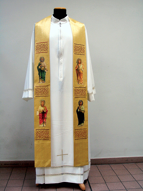 Overlay stole 5-1/4 inch wide, 58 inch long. In inch Lana Oro Barre Style inch fabric, 95% pure wool, 5% gold threads, with embroidery and printed saints on front and back.