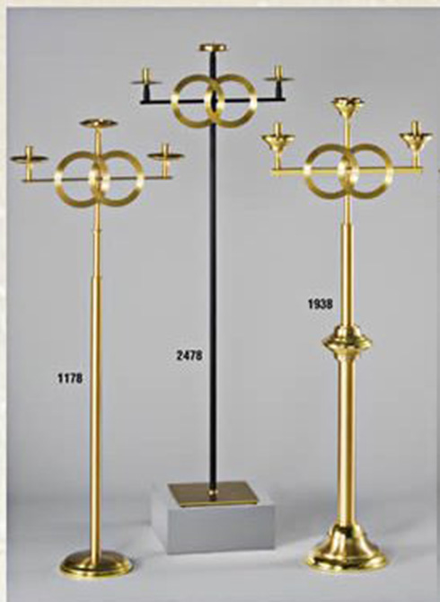 Brass with satin bronze finish, 54" high, 20" wide, 8-5/8" base diameter, two-7/8" sockets plus Christ candle holder.