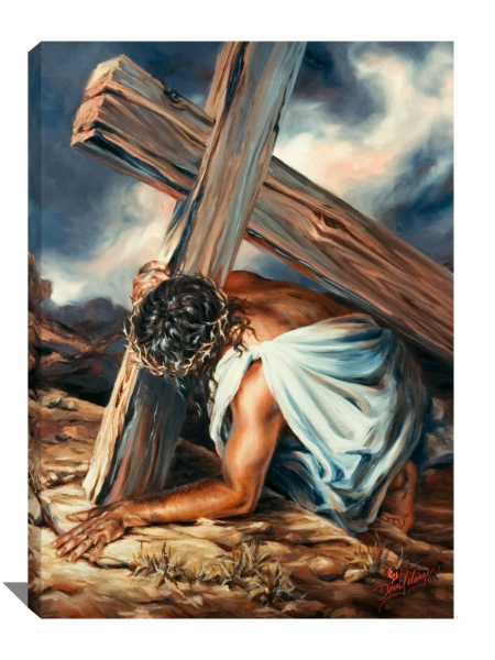 Dona Gelsinger's portrait of when Jesus fell on the stations of the cross printed on canvas and wrapped around wood stretcher bars. Premium archival canvas. Frameless and ready to hang.
