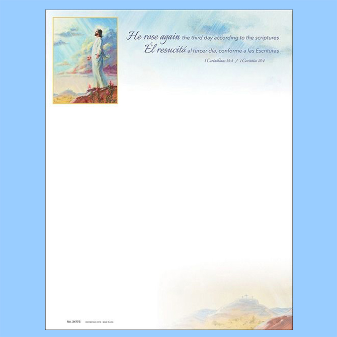 Full-color letterhead that is perfect for an Easter message or appeals letter. Sold in packs of 100's, 500's, and 1,000's.. 8-1/2" x 11".Mathcing Bilingual offering envelopes can also be purchased, SKU 22-8674.