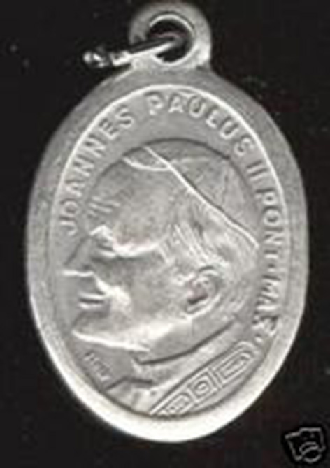 This St. Pope John Paul II oxidized silver medal is stamped on both sides in excellent detail with highly burnished edges. Approximately 0-7/8 inch x 0-5/8 inch and comes with jump ring.